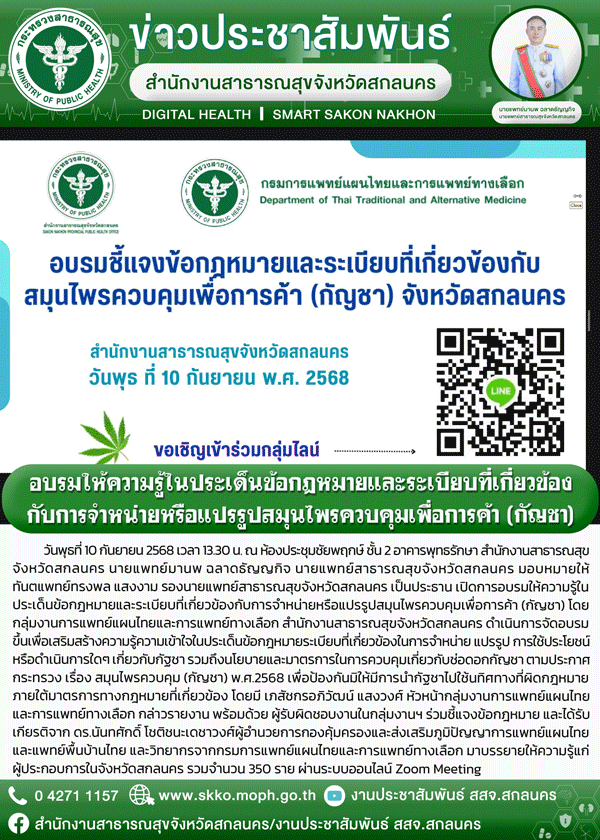 สสจ.สกลนคร “อบรมให้ความรู้ในประเด็นข้อกฎหมายและระเบียบที่เกี่ยวข้องกับการจำหน่ายหรือแปรรูปสมุนไพรควบคุมเพื่อการค้า (กัญชา)”